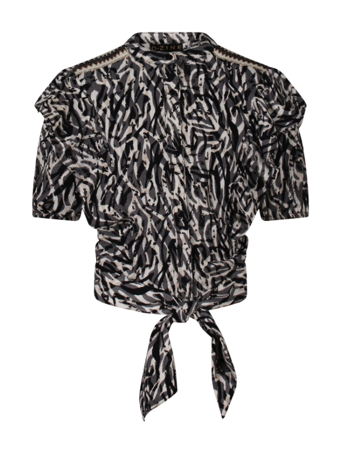 Deze luchtige blouse met dierenprint is een echte eyecatcher. Zowel aan de voor- als achterkant loopt een sierlijke ruffel, en in de taille zorgt een strikdetail voor een speels accent. Gemaakt van zachte crinkle stof en perfect te combineren met de bijpassende korte broek voor een zomerse look, of met de lange broek op koudere dagen!
