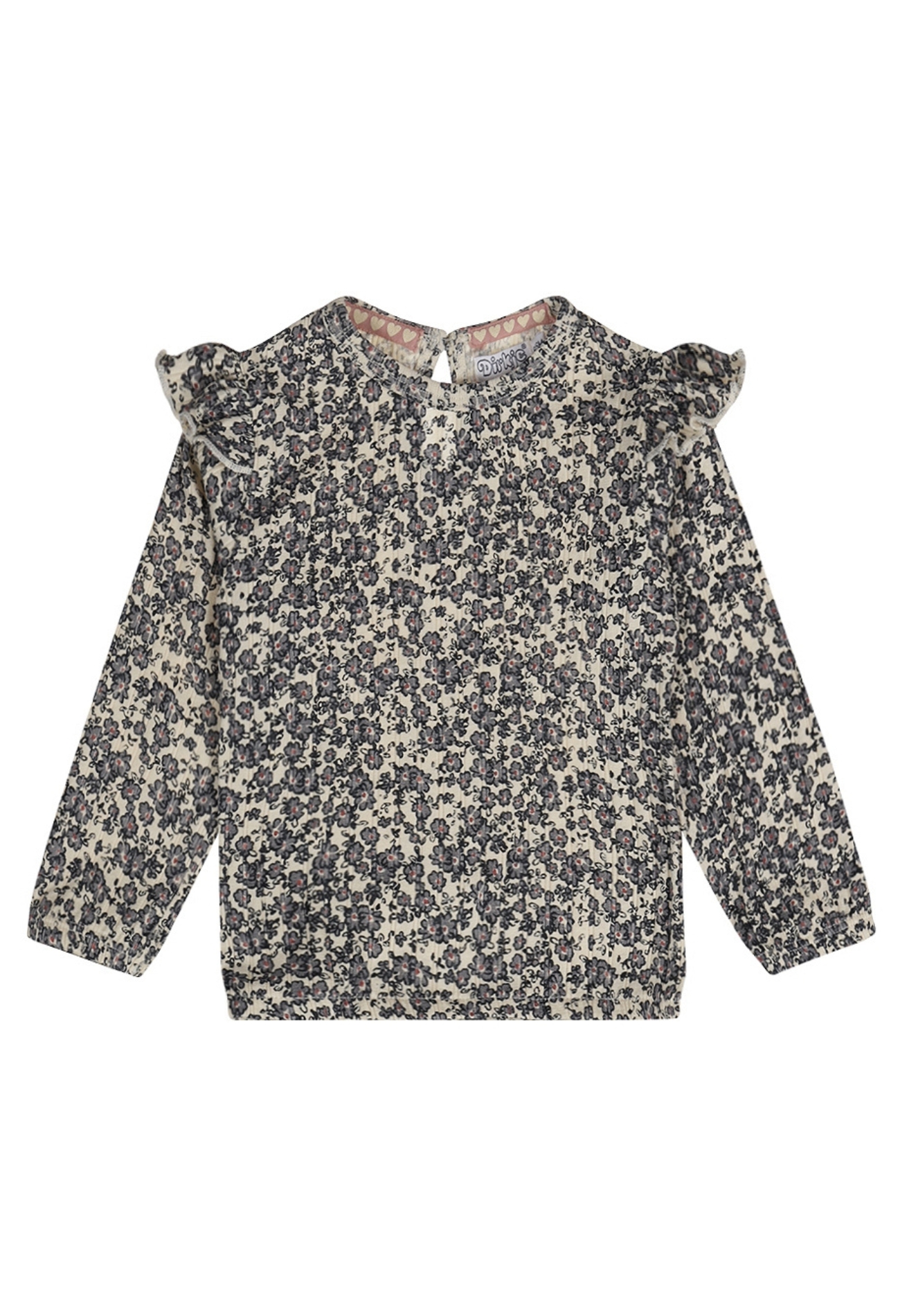 Vrolijk bloemen shirt voor meisjes, gemaakt van een zachte ribstof met een paars bloemenprintje. De ruche op de schoudernaden geeft het shirt een speelse en girly touch. Combineer het met de bijpassende flared broek voor een complete set, of draag het op een jeans voor een casual en comfortabele look!