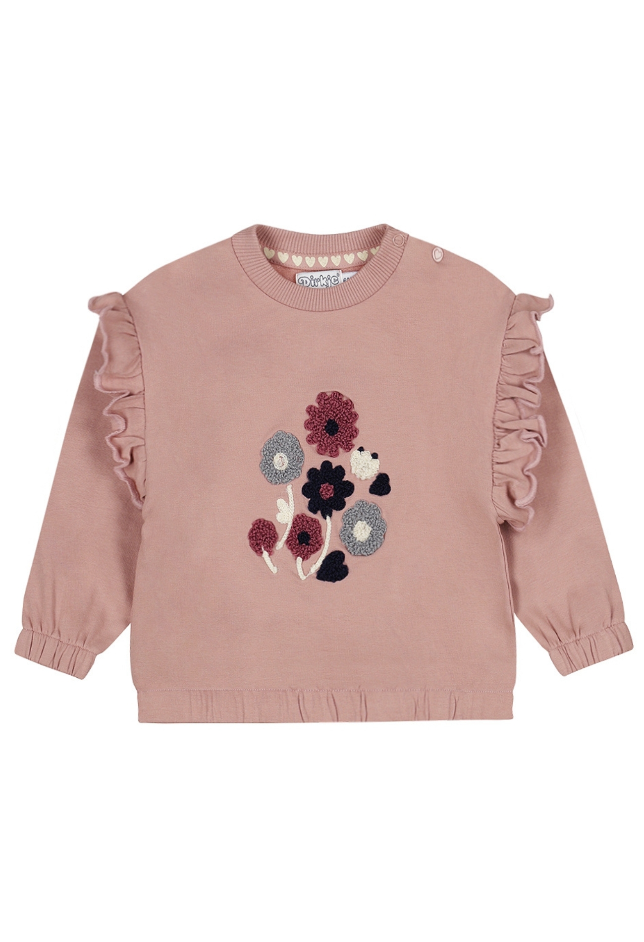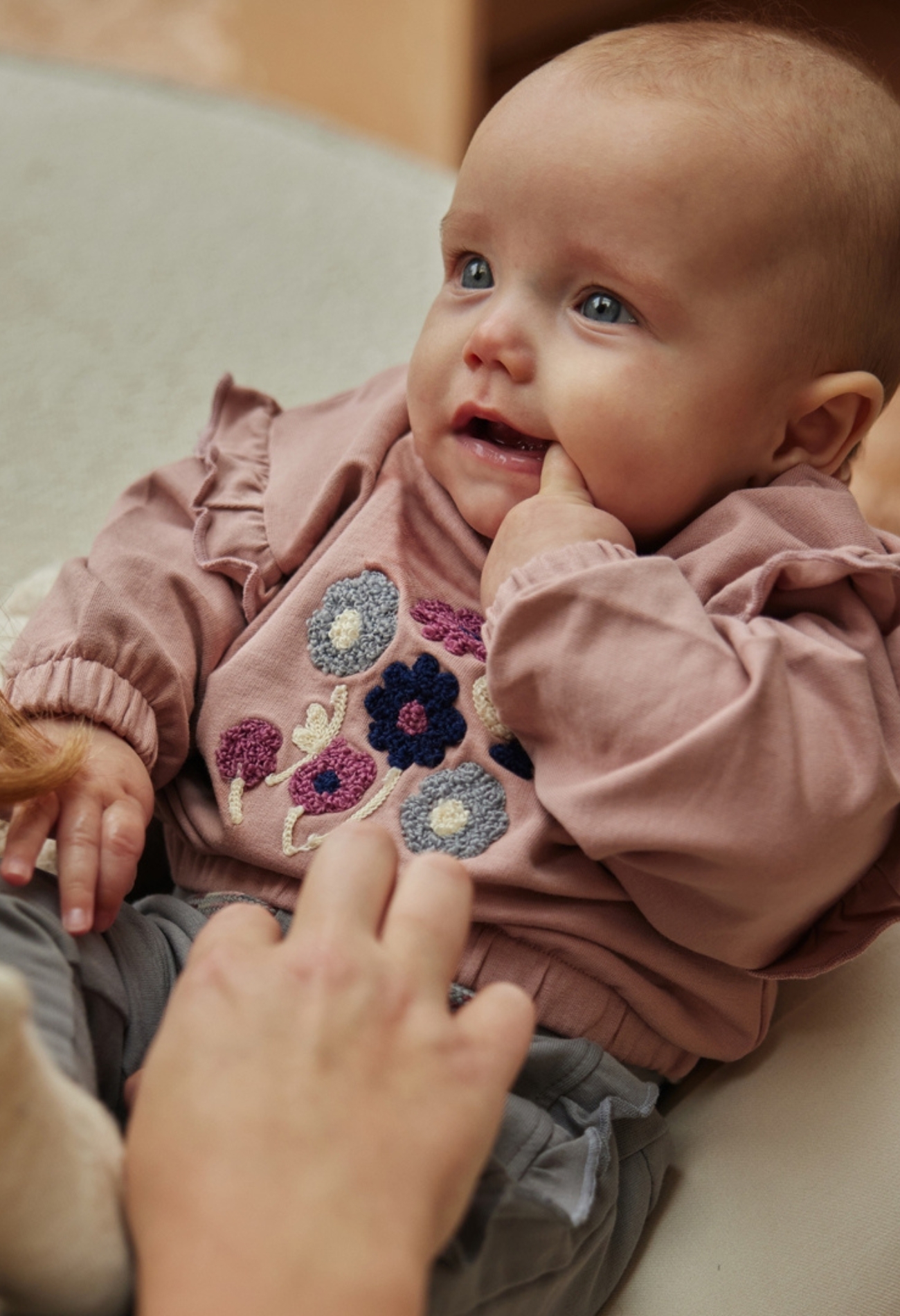 Deze schattige sweater voor baby meisjes is uitgevoerd in een prachtige oudroze mauve kleur. Op de voorkant zitten speelse bloemenpatches en langs de schouders ruches aangebracht voor een extra lieflijke uitstraling. De boord aan de onderkant en mouwuiteinden zijn is elastisch, wat zorgt voor een comfortabele pasvorm. Perfect voor een cozy en stijlvolle look!