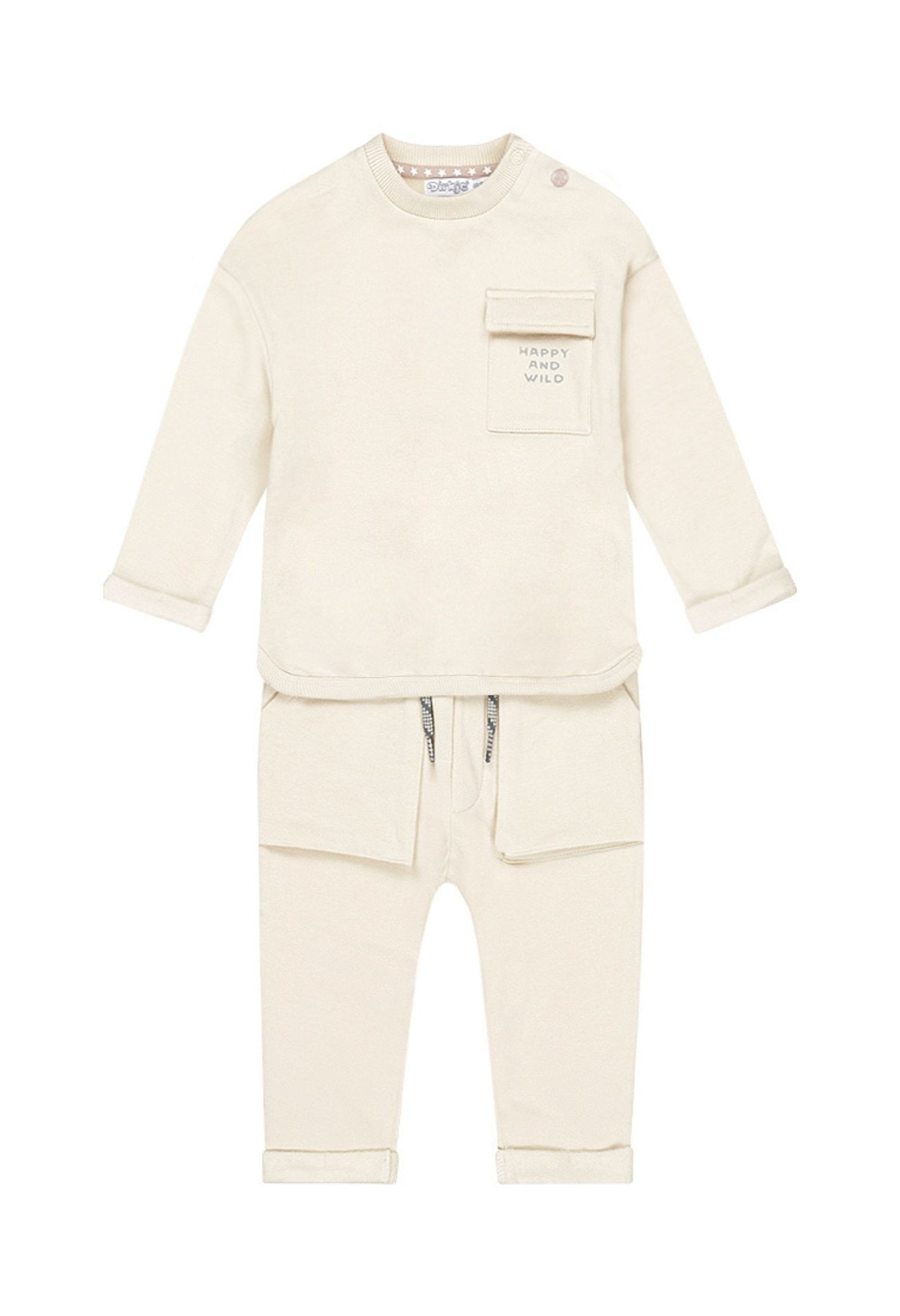 Joggerset voor baby jongens, perfect voor comfortabele speel- en relaxmomenten! De set is heerlijk zacht van binnen. De top is voorzien van een leuke borstzak met de tekst Happy and Wild als speels detail. De bijpassende broek heeft een elastische tailleband en stoere 3D-zakken voor een extra coole look. Een fijne en praktische outfit voor elke dag!