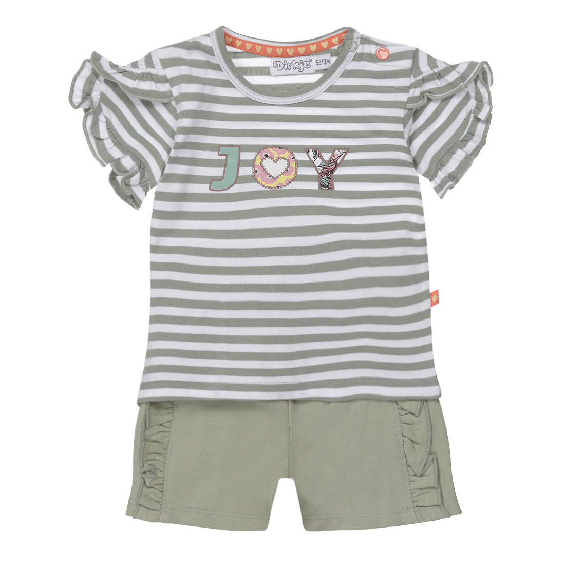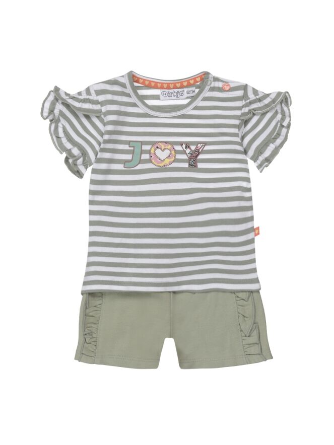 Deze 2-delige set bestaat uit een t-shirt met korte ruchemouwen een allover streepprint en voorop een tekstprint. Het bijpassende short heeft voorop twee ruchestrepen over de lengte.