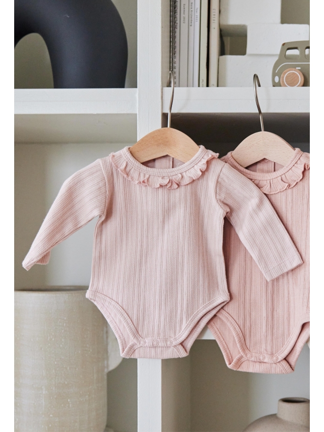 Deze leuke baby meisjes romper met ruche langs de hals is verkrijgbaar in 3 kleuren. Maar let op, licht roze en oud roze verschillen amper in kleur.
