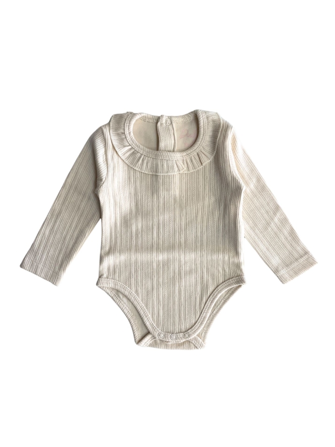 Deze leuke baby meisjes romper met ruche langs de hals is verkrijgbaar in 3 kleuren. Maar let op, licht roze en oud roze verschillen amper in kleur.