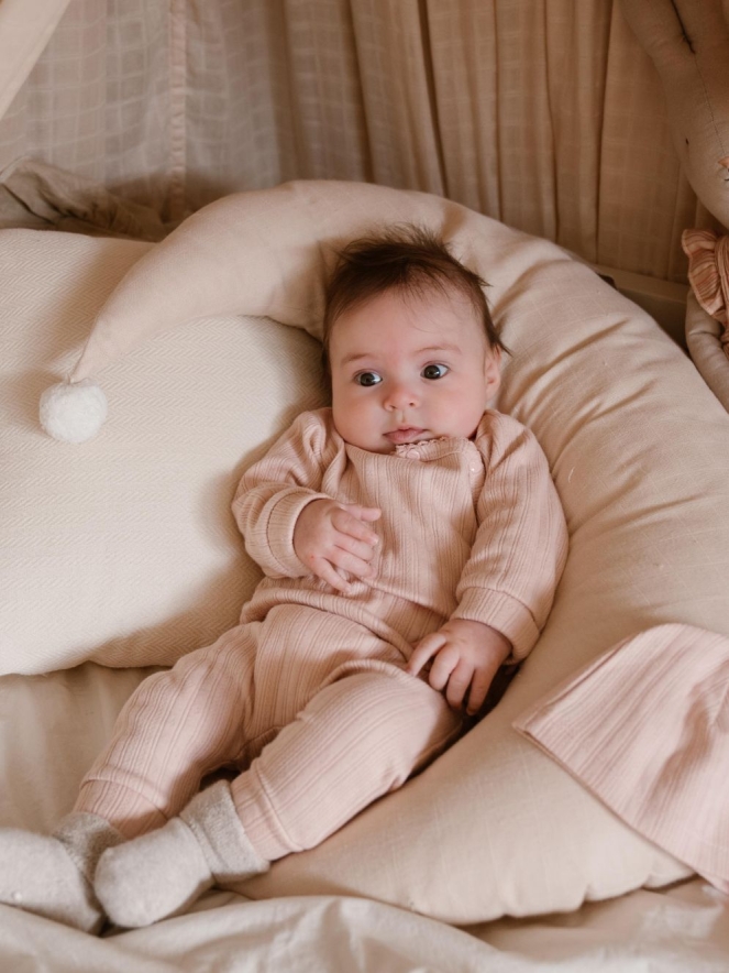 Met dit 3 delige setje van Dirkje ben je in een keer klaar. Bestaande uit een shirt, broekje en mutsje van een fijne ajour rib met stretch. Het shirt heeft een overslag welke sluit met drukknopen. Handig met aankleden en in een keer stijlvol gekleed!