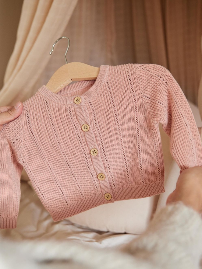 Cute! Dit licht roze vestje van ajour breisel maakt de look van ieder newborn meisje helemaal af! Met een vijftal hout look knoopjes aan de voorkant en fijne meebewegende stof kan dit vestje los of (gedeeltelijk) vast gedragen worden. Dirkje doet veel aan sustainability zo is ook dit vestje geproduceerd van Organic cotton. Katoen geteeld op een milieuvriendelijke manier!