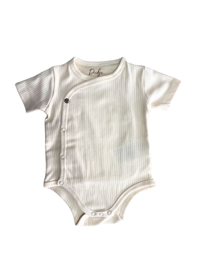 Deze overslag romper heeft een korte mouw en is zeer geschikt voor deze tijd van het jaar! Van 95% Organisch katoen, verantwoordt voor jouw kleintje en voor het milieu! Let op: De kleur off white heeft een kleine rib in de stof. De kleur zand heeft geen rib in de stof maar een kleine tekstprint.