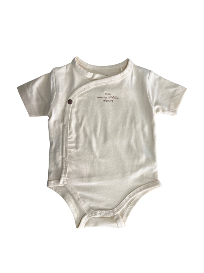 Deze overslag romper heeft een korte mouw en is zeer geschikt voor deze tijd van het jaar! Van 95% Organisch katoen, verantwoordt voor jouw kleintje en voor het milieu! Let op: De kleur off white heeft een kleine rib in de stof. De kleur zand heeft geen rib in de stof maar een kleine tekstprint.