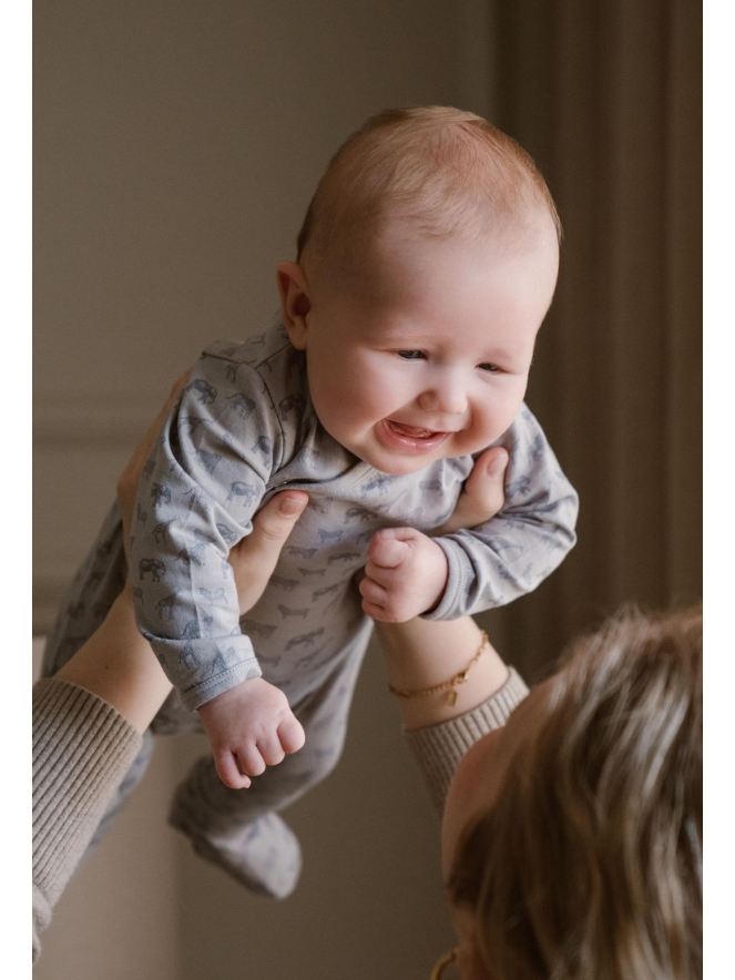 Dit leuke setje van Dirkje voor new born boys bestaat uit een pakje met bijpassende slofjes. De kleur van de stof zit tussen grijs en blauw in en heeft een print met safari dieren.