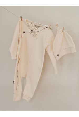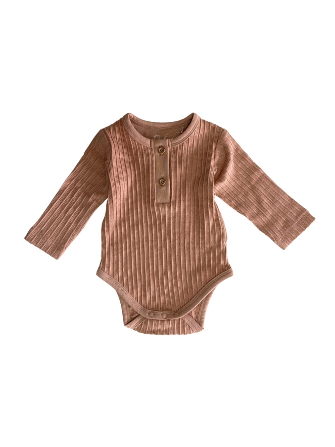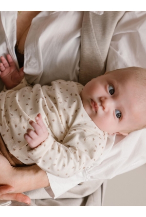 Deze romper van serafino rib stof is lekker rekbaar en heeft een lange mouw. Met 2 houtlook knoopjes voorop en natuurlijk drukkers bij het kruis.