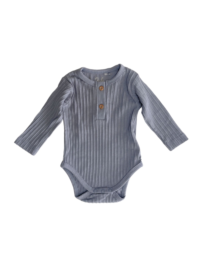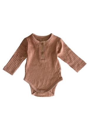 Deze romper van serafino rib stof is lekker rekbaar en heeft een lange mouw. Met 2 houtlook knoopjes voorop en natuurlijk drukkers bij het kruis.