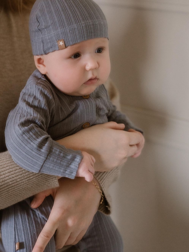 Deze 2 delige set bestaande uit een pakje met bijpassende muts is gemaakt van organisch katoen. De stof is lekker rekbaar en daardoor erg comfortabel. Het pakje heeft knopen aan de voorkant in houtlook en drukknoopje rond de binnenkant van de benen. Praktisch!