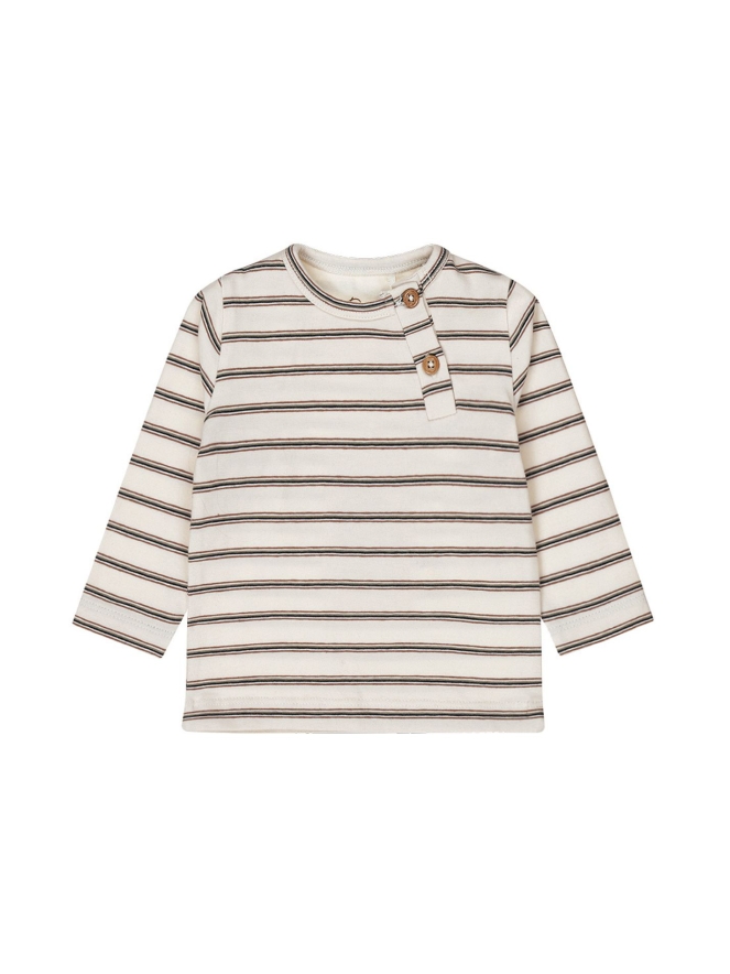 Dit mooie serafino shirt van Dirkje vervaardigd uit 95% organisch katoen heeft een bruin grijs zwart streepjes motief en houtlook knoopjes.