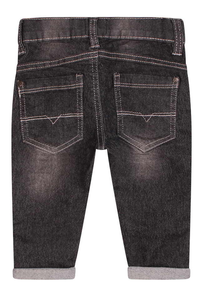 Mooie stretch jeans voor baby boys. Deze 5 pocket sluit met een haak sluiting en is verder vrij basic en neutraal. De lengte nog wat lang? Sla de broekspijp dan even om. Zo heb je een broekje op de groei want ook de taille is gewoon te verstellen. Met leuke aap sleutelhanger!