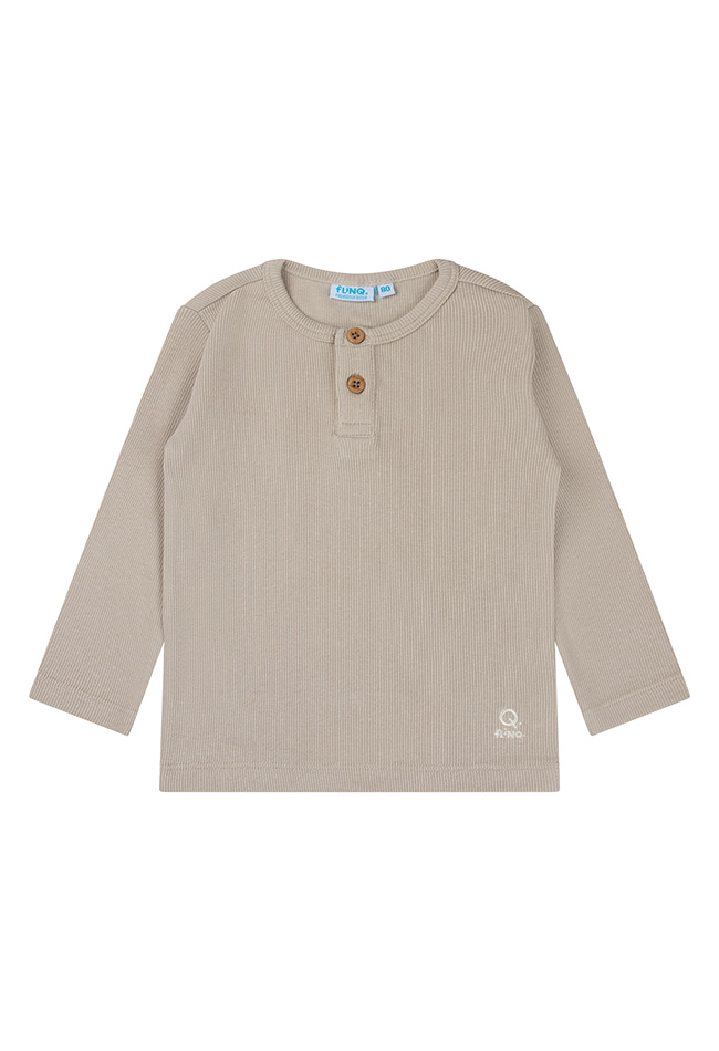 Effen serafino top met lange mouwen voor baby boys! Dit basic shirt hebben we in meerdere verschillende rustige kleuren. Met een kleine rib in de stof en lekker stretchy voor een hoog comfort gehalte.