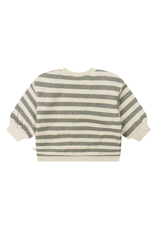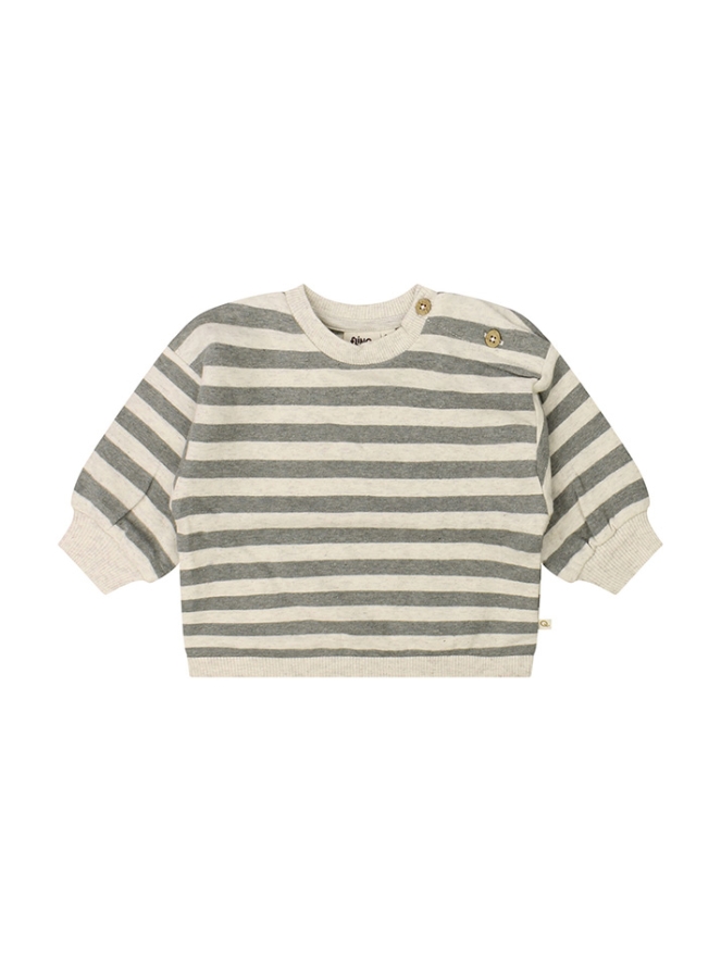 Fijne en vooral zachte sweater voor newborn baby boys. Met een mooie streep en houtlook knoopsluiting op de schouder. Tijdloos design.