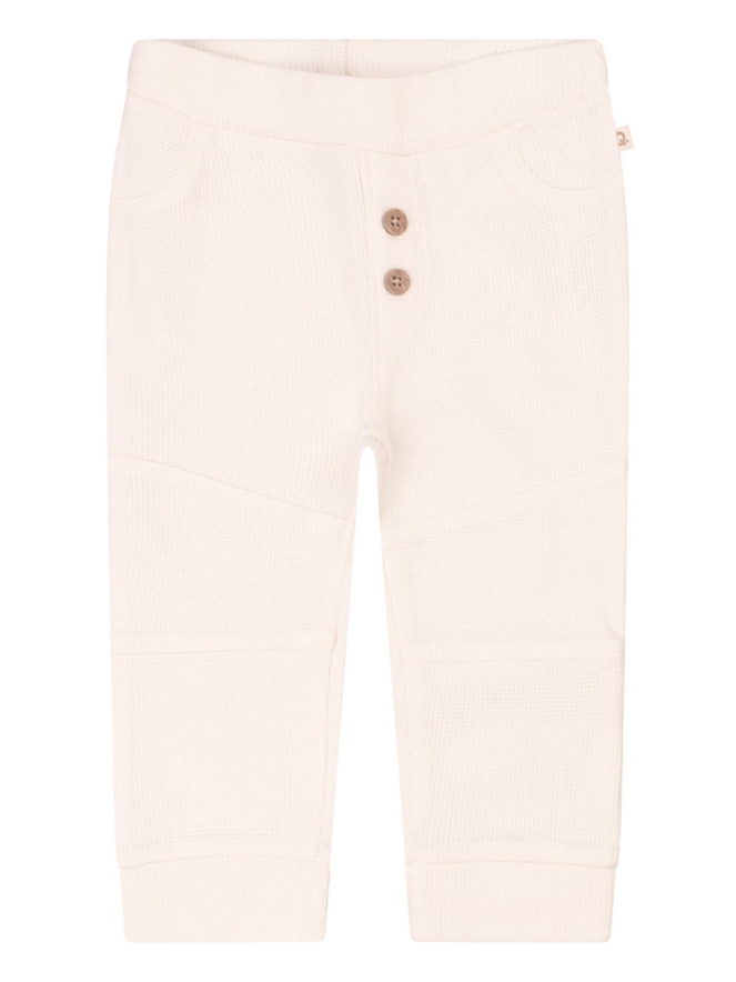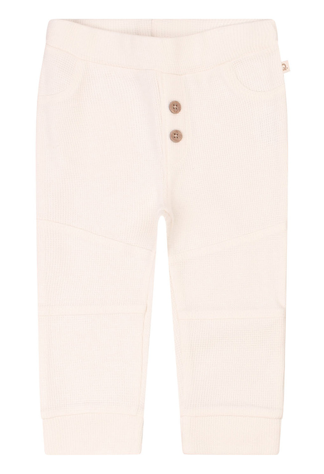 Deze lange broek voor newborn jongens is gemaakt van heel fijn wafeldoek. Dit broekje heeft stoere details zoals de houtlook knoopjes, sierzakjes en de deelnaden op de knie. Dit broekje laat zich perfect combineren met het shirtje van art.nr. Z10129