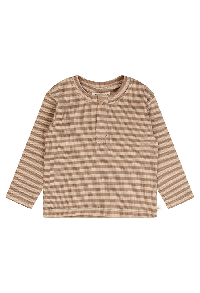 Een lief en comfortabel shirt dat perfect te combineren is met het bijpassende broekje voor een complete newborn look. Art.nr. Z10131. Het shirt is uitgevoerd in een tijdloos streeppatroon en gemaakt van biologisch katoen, waardoor het heerlijk zacht en vriendelijk is voor de gevoelige babyhuid. De wafeldoek structuur geeft het shirt een subtiele textuur en zorgt voor een luchtig, ademend draagcomfort. Het serafino model met knoopje bij de hals maakt het aan- en uitkleden extra makkelijk.