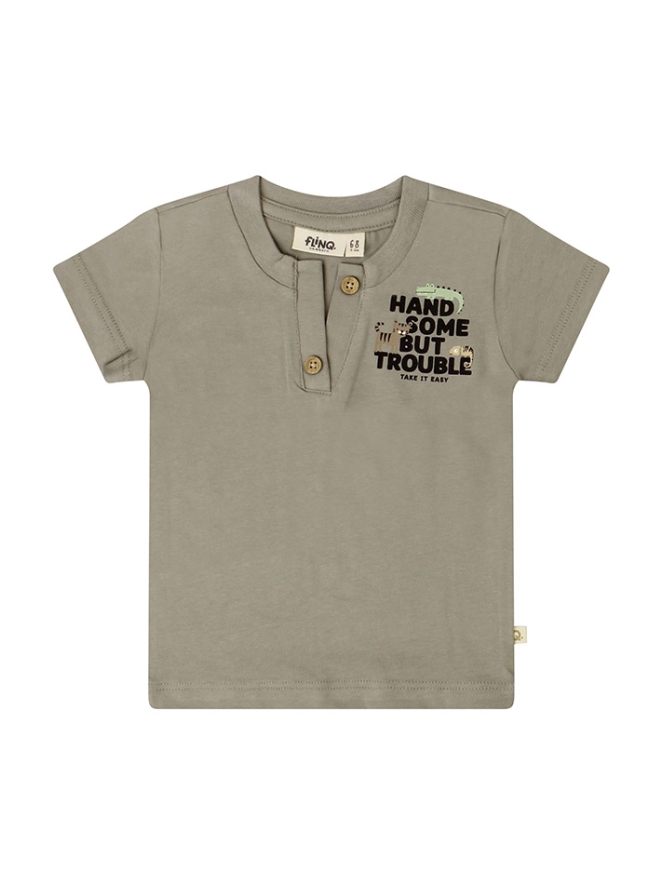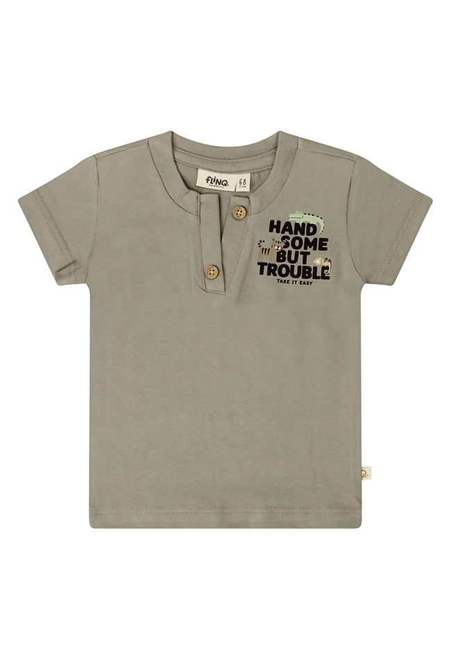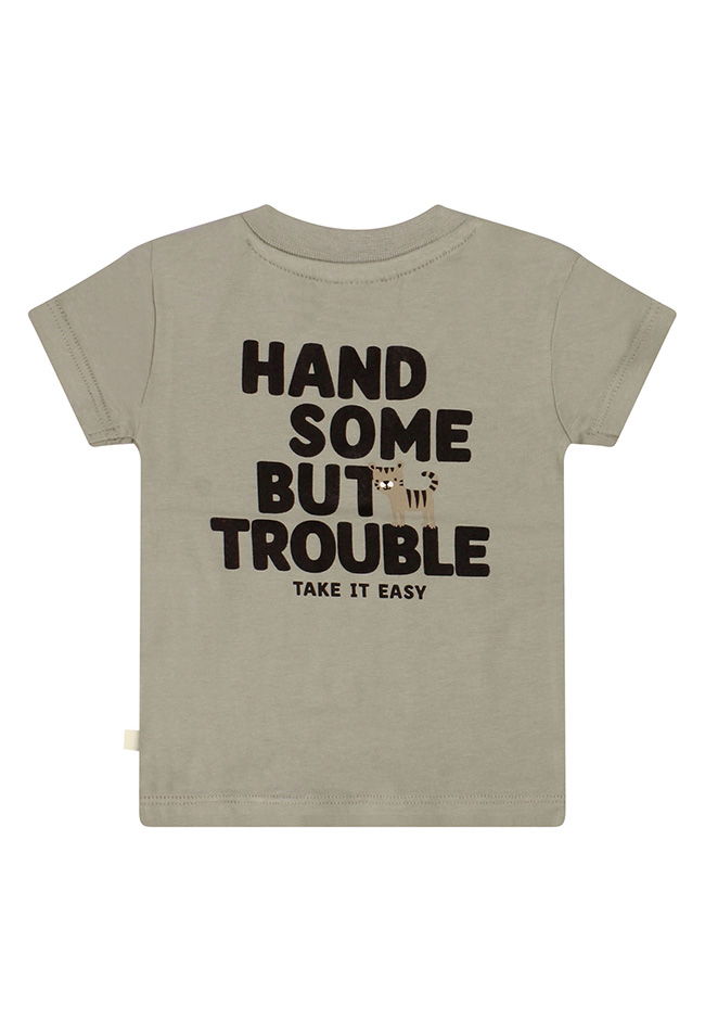 Handsome but trouble! Dit stoere T-shirtje met mooie open serafino hals heeft een leuke print voor en achterop voor kleine troublemakers!