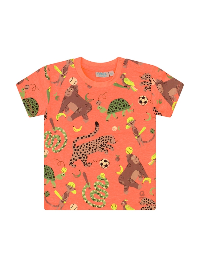 Vrolijk T-shirt met een allover print met dieren uit de jungle. In frisse zomerse kleuren maakt jouw stoere bink de blits!