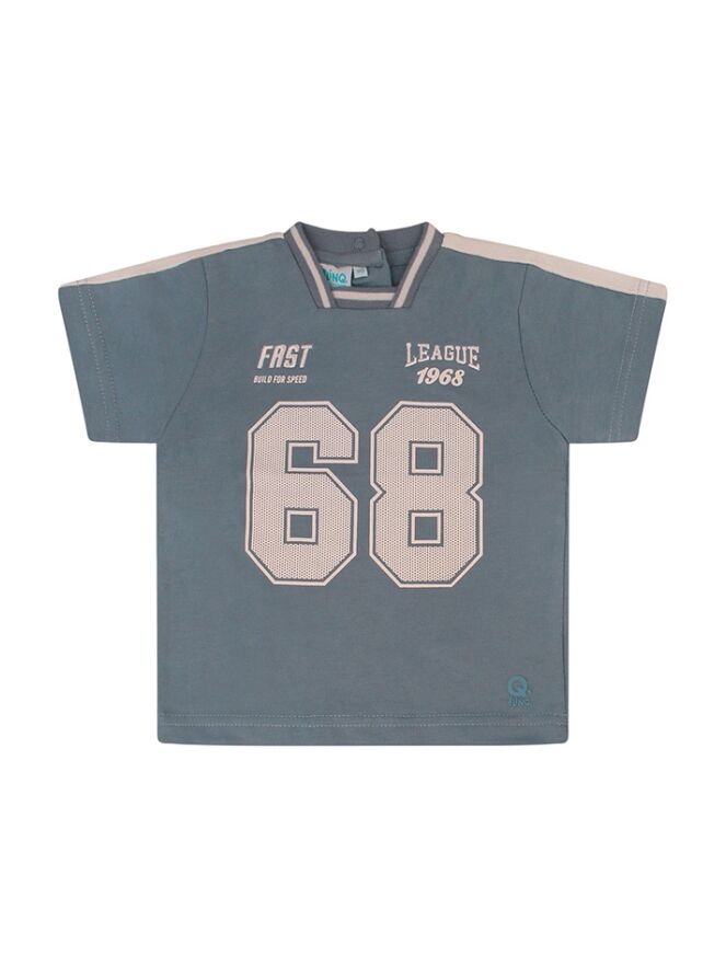Dit T-shirt van sweaterstof is een stoere! Met een mooi grote print voorop en een mooie onderbroken V-hals doet hij eigenlijk aan als een baseball shirt!