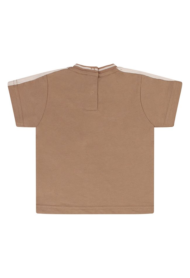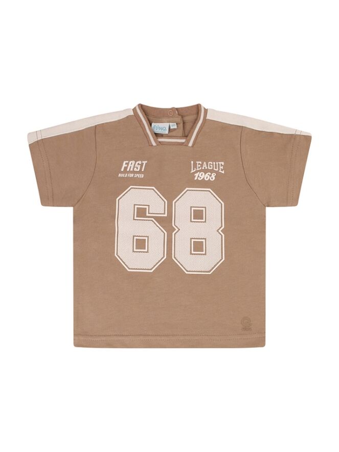 Dit T-shirt van sweaterstof is een stoere! Met een mooi grote print voorop en een mooie onderbroken V-hals doet hij eigenlijk aan als een baseball shirt!