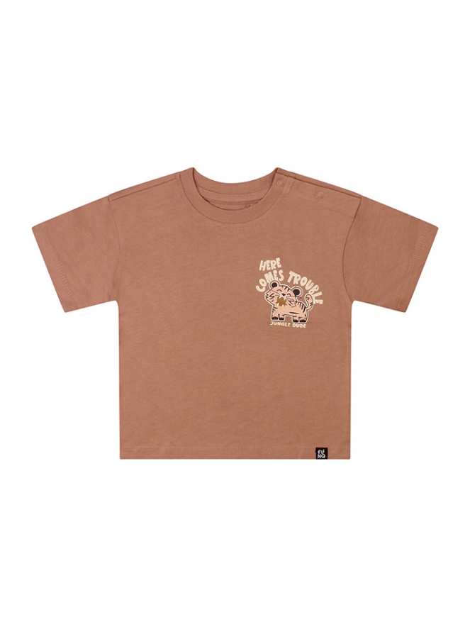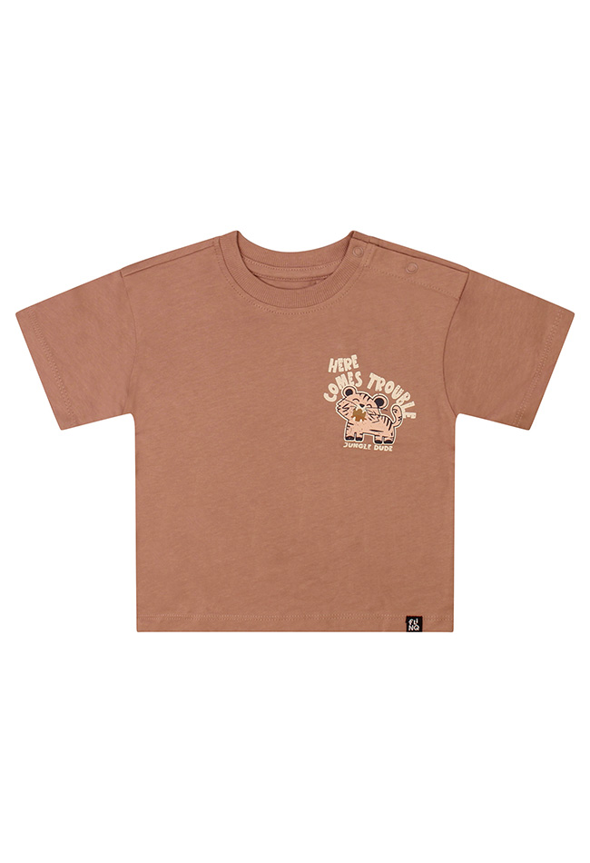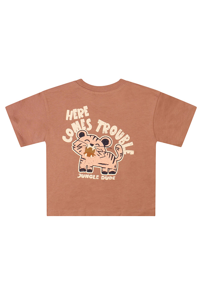 Laat je kleine avonturier opvallen met dit stoere T-shirt voor babyjongens. Het shirt heeft een speels ?Here Comes Trouble? design aan de voorkant en een coole leeuw op de rug, perfect voor kleine junglehelden. Roarrrr! Let op, valt wat wijder want dit is een boxy fit.
