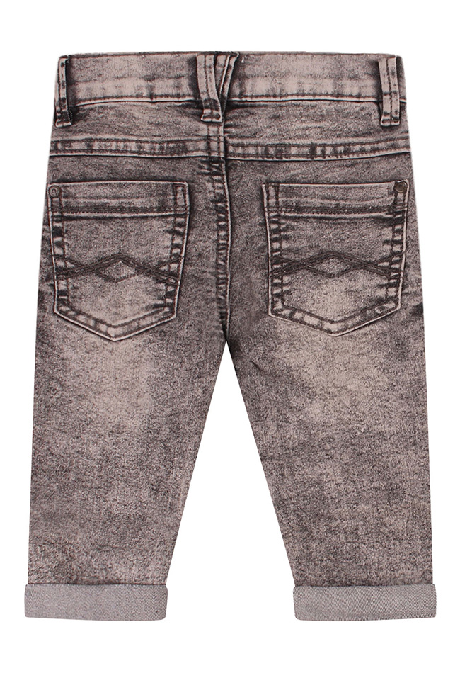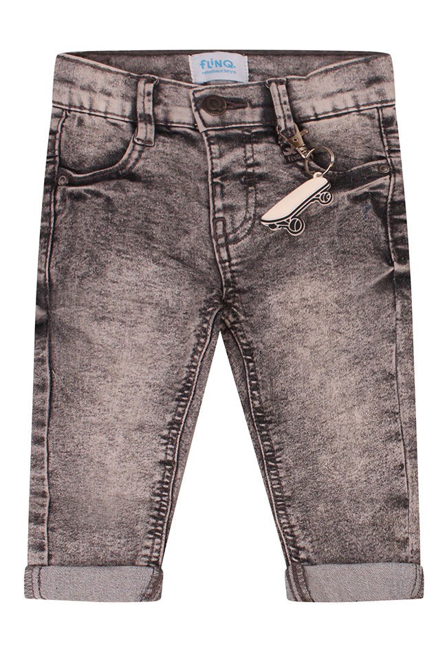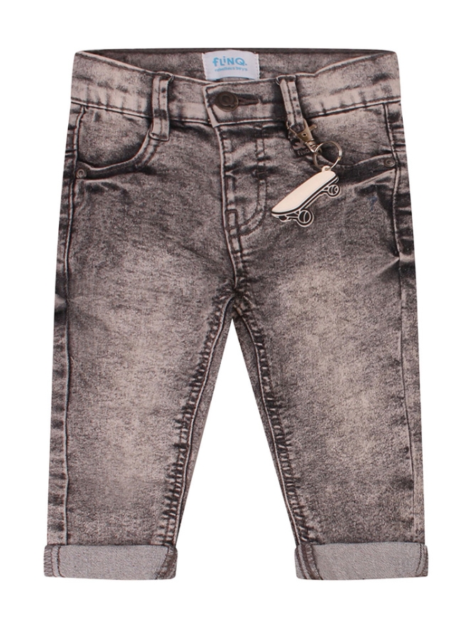 Dit lieve denim broekje voor baby jongens combineert comfort met een speelse uitstraling. Dankzij de verstelbare tailleband zit het broekje altijd perfect en groeit het fijn mee. Als extra leuk detail is er een stoere skateboard sleutelhanger toegevoegd.