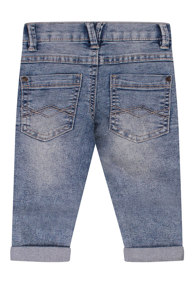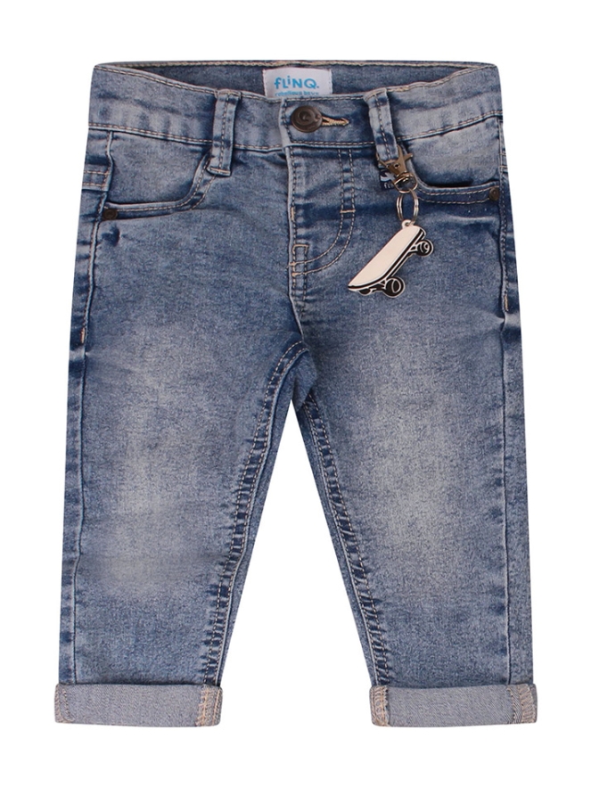 Dit lieve denim broekje voor baby jongens combineert comfort met een speelse uitstraling. Dankzij de verstelbare tailleband zit het broekje altijd perfect en groeit het fijn mee. Als extra leuk detail is er een stoere skateboard sleutelhanger toegevoegd.