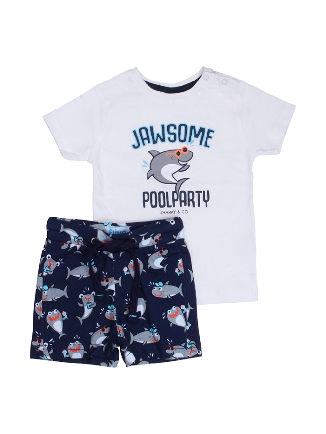 Setje met t-shirt en matching broekje voor baby jongens. Het broekje heeft een haaien print en het t-shirt heeft de tekst Jawsome en een coole haai. Materiaal: 100% katoen