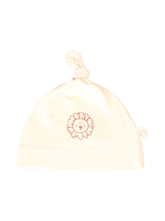 Dit new born knoop mutsje heeft een kleine afbeelding van een leeuw op de voorkant.
