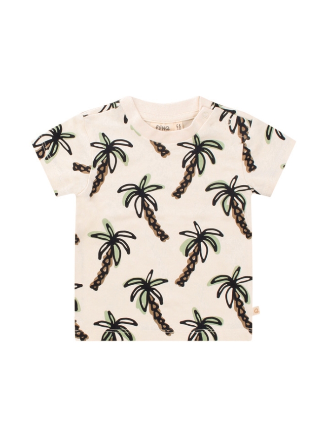 Dit Flinq newborn T-shirt is perfect voor de allerkleinsten! Gemaakt van 95% biologisch katoen en 5% elastaan, voelt het heerlijk zacht en rekbaar aan, ideaal voor de gevoelige babyhuid. De palmboomprint geeft een zomerse en speelse uitstraling. Dankzij de drukknopen op de schouder is het T-shirt gemakkelijk aan en uit te trekken. De ronde hals zorgt voor een comfortabele pasvorm, terwijl de korte mouwen voldoende ventilatie bieden op warme dagen.