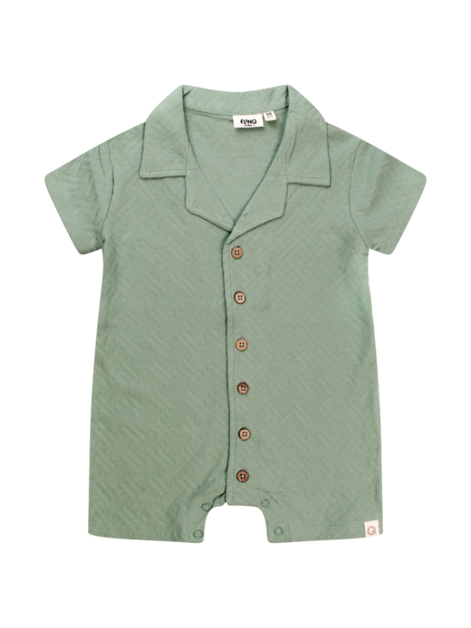 Deze Flinq newborn jumpsuit is een stijlvolle en comfortabele keuze voor de allerkleinsten. Gemaakt van 100% katoen, voelt de stof heerlijk zacht en ademend aan, perfect voor warme dagen. De jacquard visgraatstructuur geeft de jumpsuit een verfijnde en luxe uitstraling. De reverskraag en houtlook knopen aan de voorkant zorgen voor een klassieke en schattige look, terwijl de drukknopen bij het kruis het verschonen en aan en uit trekken extra makkelijk maken. Dankzij de korte mouwen en luchtige stof blijft je baby comfortabel, zelfs bij warm weer.