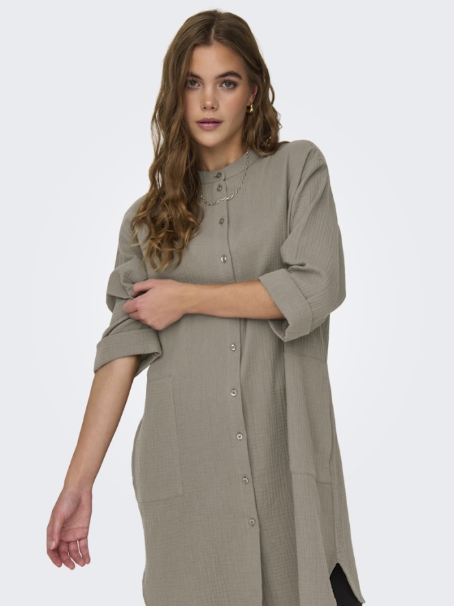 Deze blouse van JDY heeft een halve mouw en is een oversized model en valt net boven de knie. De blouse heeft twee grote steekzakken en loopt rond aan de onderkant. De mouwen zijn omgeslagen. Het materiaal is 100% katoen waarvan 20% gerecycled katoen.