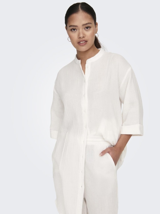 Deze blouse van JDY heeft een halve mouw en is een oversized model en valt net boven de knie. De blouse heeft twee grote steekzakken en loopt rond aan de onderkant. De mouwen zijn omgeslagen. Het materiaal is 100% katoen waarvan 20% gerecycled katoen.
