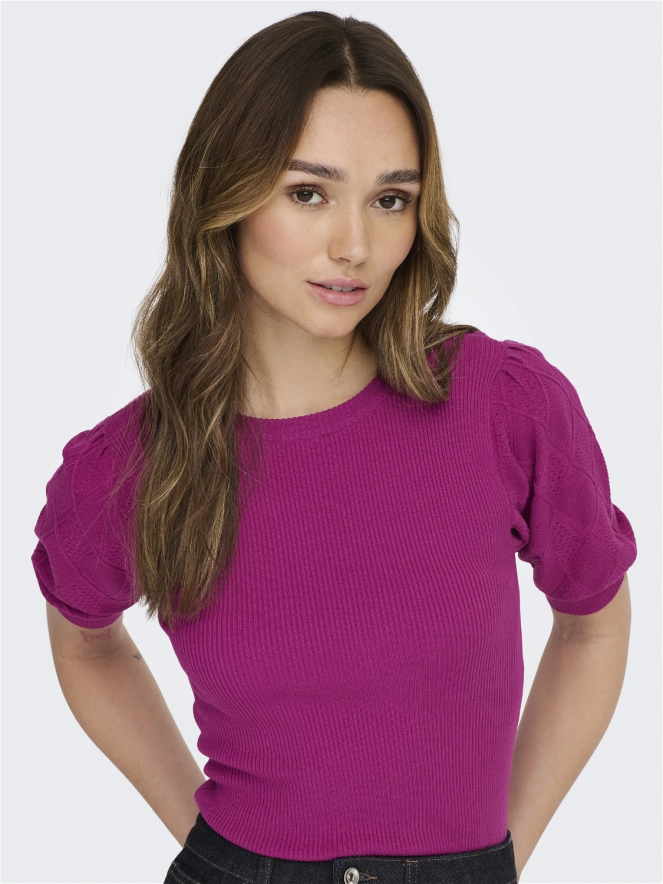 Deze top heeft speciale mouwen. De mouwen zijn twee kwart lengte en zijn ballon vormig met ajour patroon.
