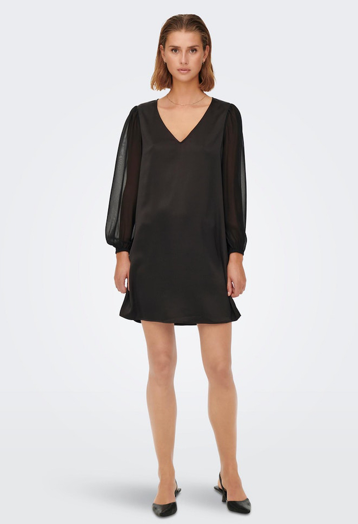 Jurkje van JDY. Het jurkje is van gladde satijnen stof en heeft mesh mouwen. Het jurkje heeft pofmouwen en een losse fit. Materiaal: 96% polyester, 4% elasthan, mouwen: 110% polyester. Wassen op 30 graden, niet bleken, niet in de droger, laag strijken.