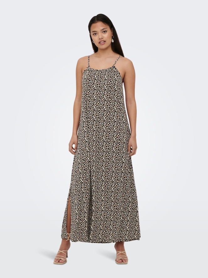 Jurk van JDY. Deze lange maxi jurk heeft een allover print met spaghetti bandjes en een split.