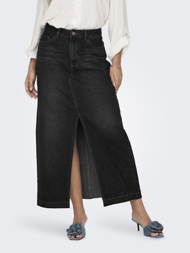 Lange rok van echte Denim Jeans. Geen stretch meer maar echt Denim. Met een hoge split aan de voorkant en onafgewerkte rand aan de onderkant. Leuk te combineren met een sweater, T-shirtje of leuke top.