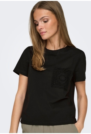 T-shirtje met opdruk van kleine hartjes. Het grote hart zijn opgestikte stofrondjes in de vorm van een hart. Leuk onder een blazer!