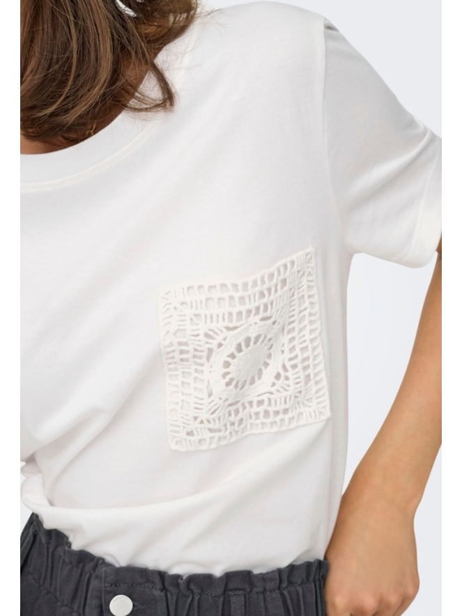 Dit T-shirt met crocket zakje is net even anders dan je gewend bent maar een hot item! Crocket is helemaal trendy deze zomer en zo op een effen item is een super leuke toegevoegde waarde. Met dit shirt kan je alle kanten op. Combineert goed op jeans maar ook op een leuke rok! Mix en match!!