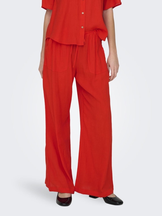 Deze ruimvallende broek heeft een smalle elastische band in de taille met een koord. Pluspunt van deze broek zijn de twee steekzakken.