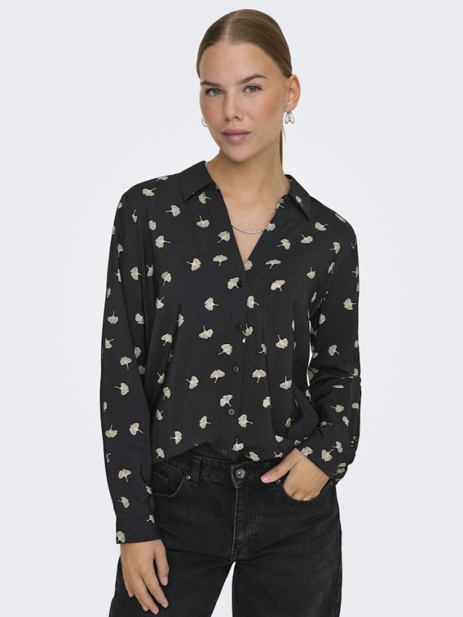 Zwarte blouse met V hals en overhemd kraagje. Deze blouse heeft een print met blaadjes. Casual te dragen of classy op een zwarte pantalon met een hak eronder. Tijdloos item dat niet in jouw kast mag ontbreken!