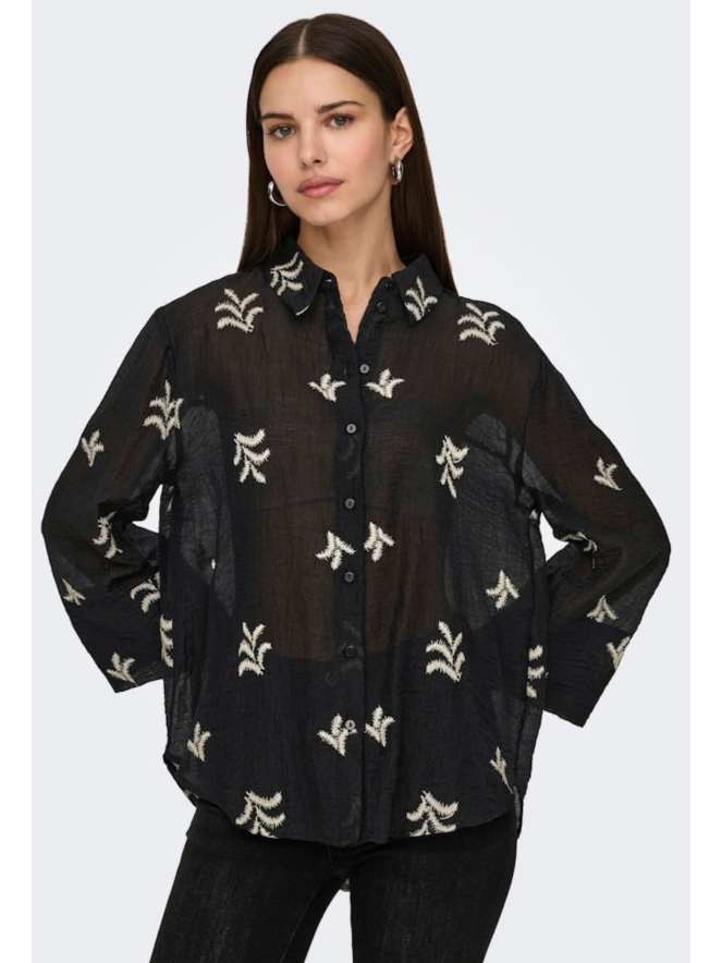 Deze dunne licht doorschijnende blouse heeft een oversized fit en een allover geborduurde print. Hoe ga jij dit pareltje dragen?