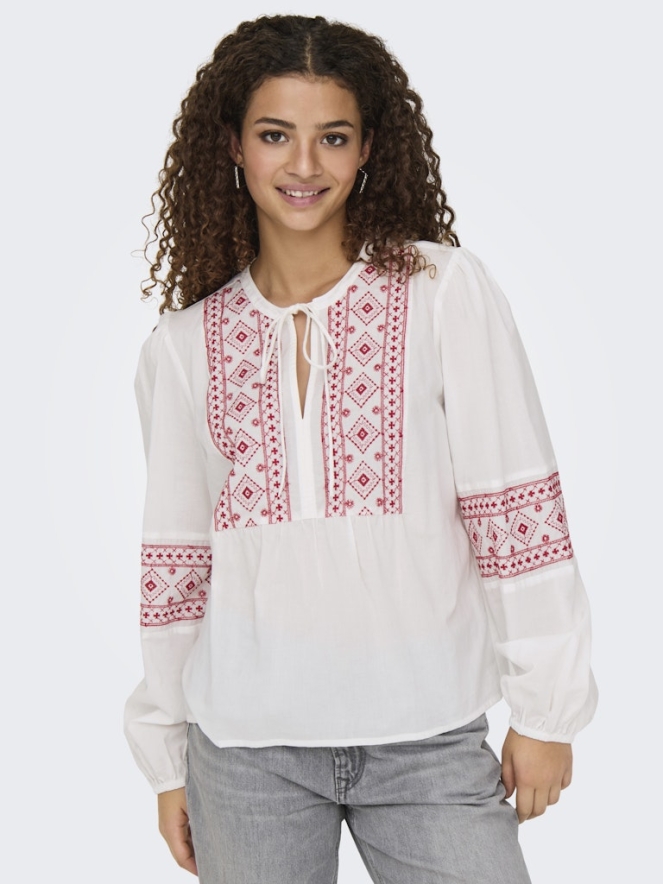 Zomerse top met een nostalgische twist! Deze fraaie top met borduursel voorop en op de mouwen valt oversized en is een dun exemplaar en dus zeer geschikt voor warme dagen.