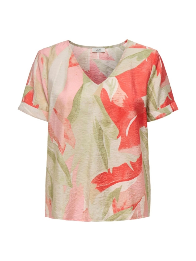 Deze dames top met bladprint in frisse groen- en roodtinten is een perfecte keuze voor de zomer. De mooie V-hals zorgt voor een vrouwelijke touch, terwijl het omgeslagen mouwtje een speels detail toevoegt. Gemaakt van een luchtige, soepel vallende stof, ideaal voor warme dagen. Combineer de top met een short, rok of de bijpassende broek voor een complete en stijlvolle zomerse outfit.