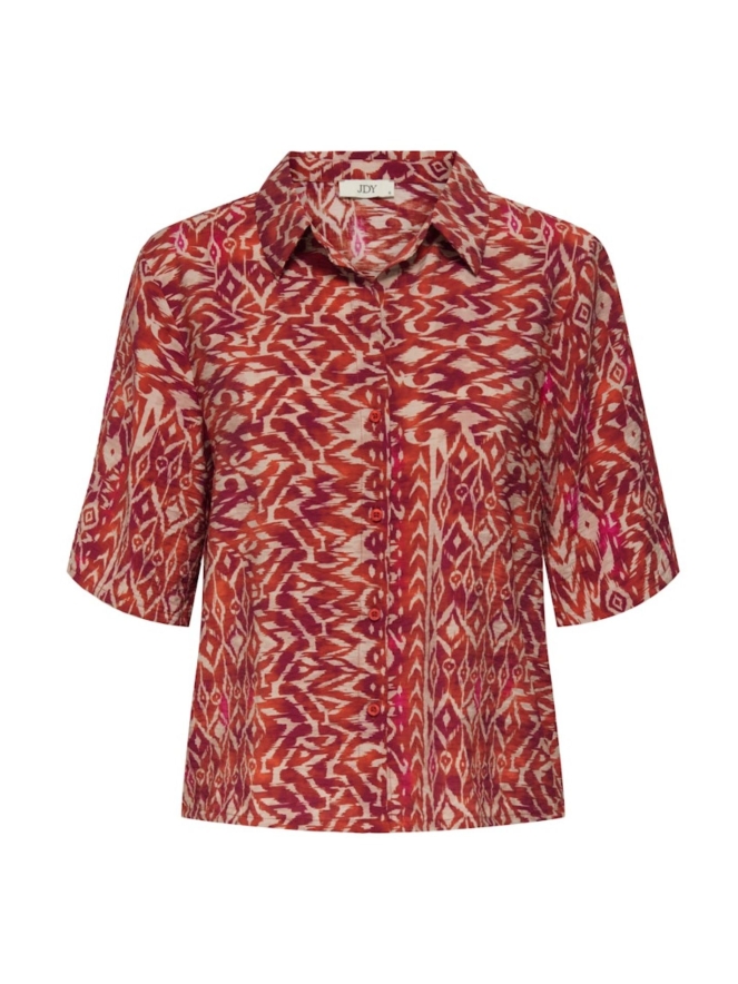 Deze blouse is de perfecte keuze voor een herfstige look met een moderne twist. Gemaakt van een lichte stof, biedt de blouse zowel comfort als stijl, waardoor het ideaal is om onder een blazer of spijkerjasje te dragen. Het opvallende ikat patroon in prachtige herfstkleuren zorgt voor een unieke uitstraling.