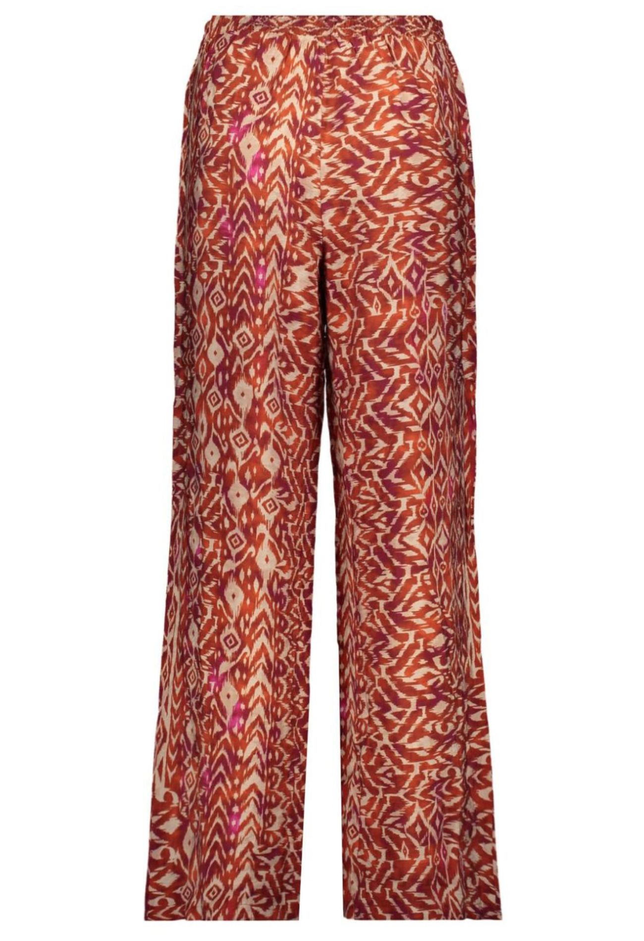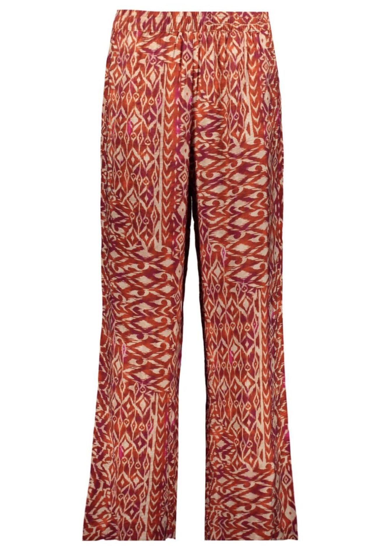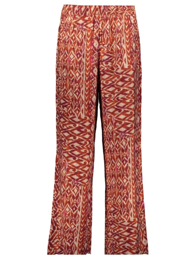 Deze dames broek combineert comfort en stijl met zijn elastische tailleband en het opvallende ikat patroon in prachtige herfstkleuren. De broek biedt een soepele pasvorm die je de hele dag comfortabel houdt, terwijl de unieke print een speelse en moderne uitstraling geeft.