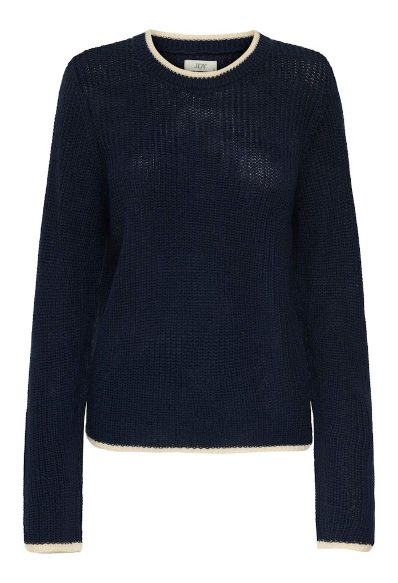 Fijne pullover met een contrasterend lijntje ronde de kraag, mouwen en middel. Dit model valt wat wijder.