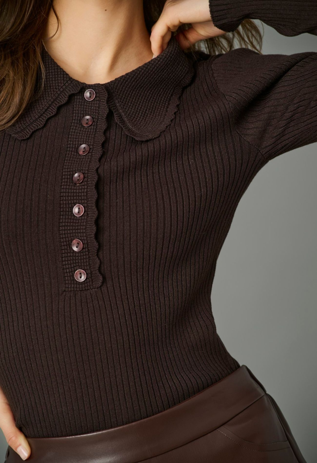 Prachtige pullover met jaren '60 kraagje en afwerking! In de trendy kleur bruin van dit seizoen! Draag het op een jeans voor een casual trendy look!