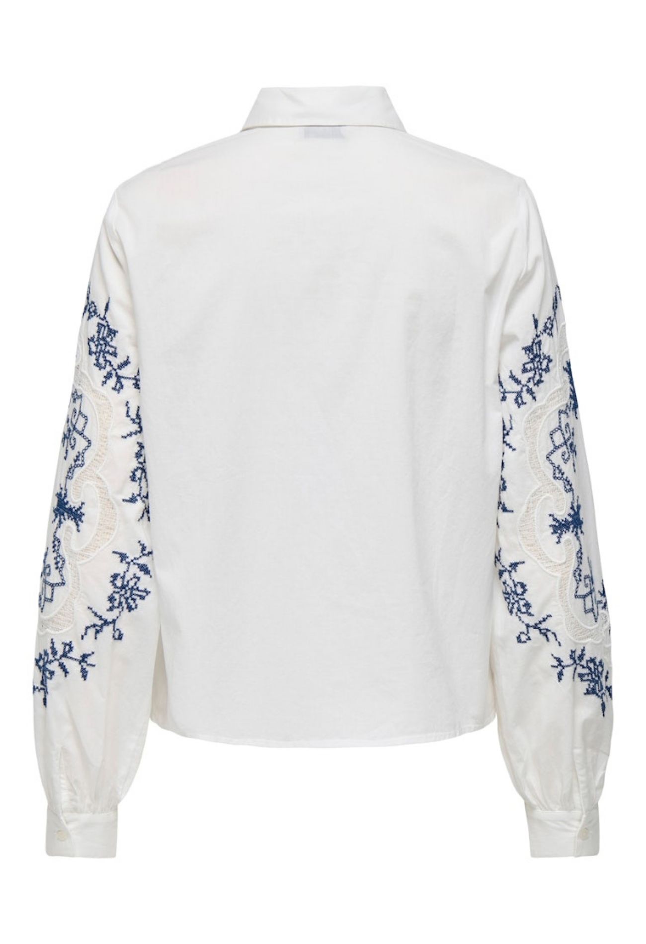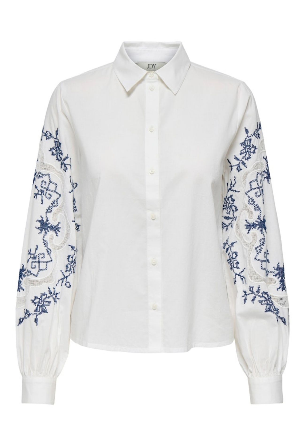 Deze blouse van JDY blinkt uit om z'n mouwen. De mouwen hebben een ballonvorm en hebben een prachtig borduusel in het blauw. De blouse is een recht model en valt iets wijder.